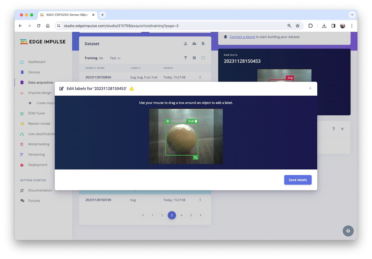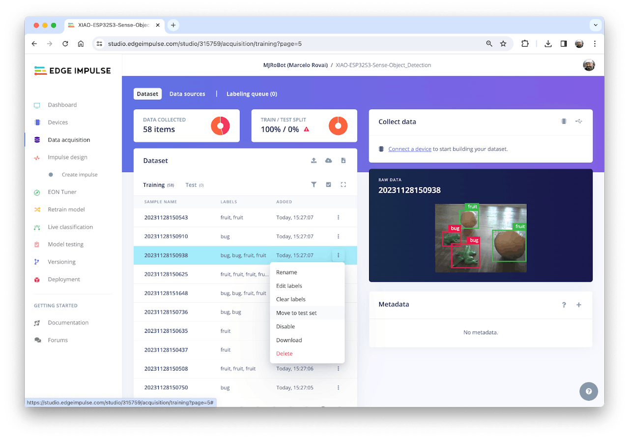 After labeling all data, it was realized that the class fruit had many more samples than the bug. So, 11 new and additional bug images were collected (ending with 58 images). After labeling them, it is time to select some images and move them to the test dataset. You can do it using the three-dot menu after the image name. I selected six images, representing 13% of the total dataset.