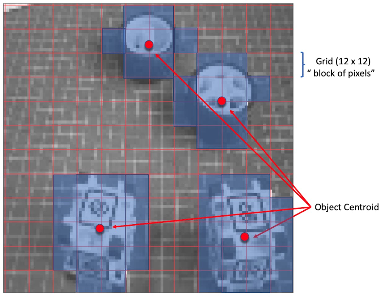 FOMO takes the image in grayscale and divides it into blocks of pixels using a factor of 8. For the input of \(96\times 96\), the grid would be \(12\times 12\) \((96/8=12)\). Next, FOMO will run a classifier through each pixel block to calculate the probability that there is a box or a wheel in each of them and, subsequently, determine the regions that have the highest probability of containing the object (If a pixel block has no objects, it will be classified as background). From the overlap of the final region, the FOMO provides the coordinates (related to the image dimensions) of the centroid of this region.