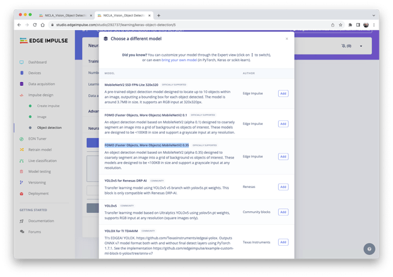 For training, we should select a pre-trained model. Letâs use the FOMO (Faster Objects, More Objects) MobileNetV2 0.35. This model uses around 250 KB of RAM and 80 KB of ROM (Flash), which suits well with our board.