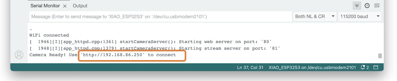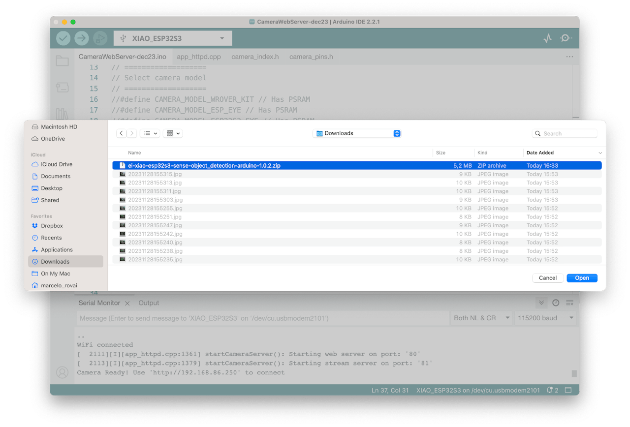 Open the Arduino IDE and select the XIAO_ESP32S3 board (and the port where it is connected). On File > Examples > ESP32 > Camera, select CameraWebServer.
