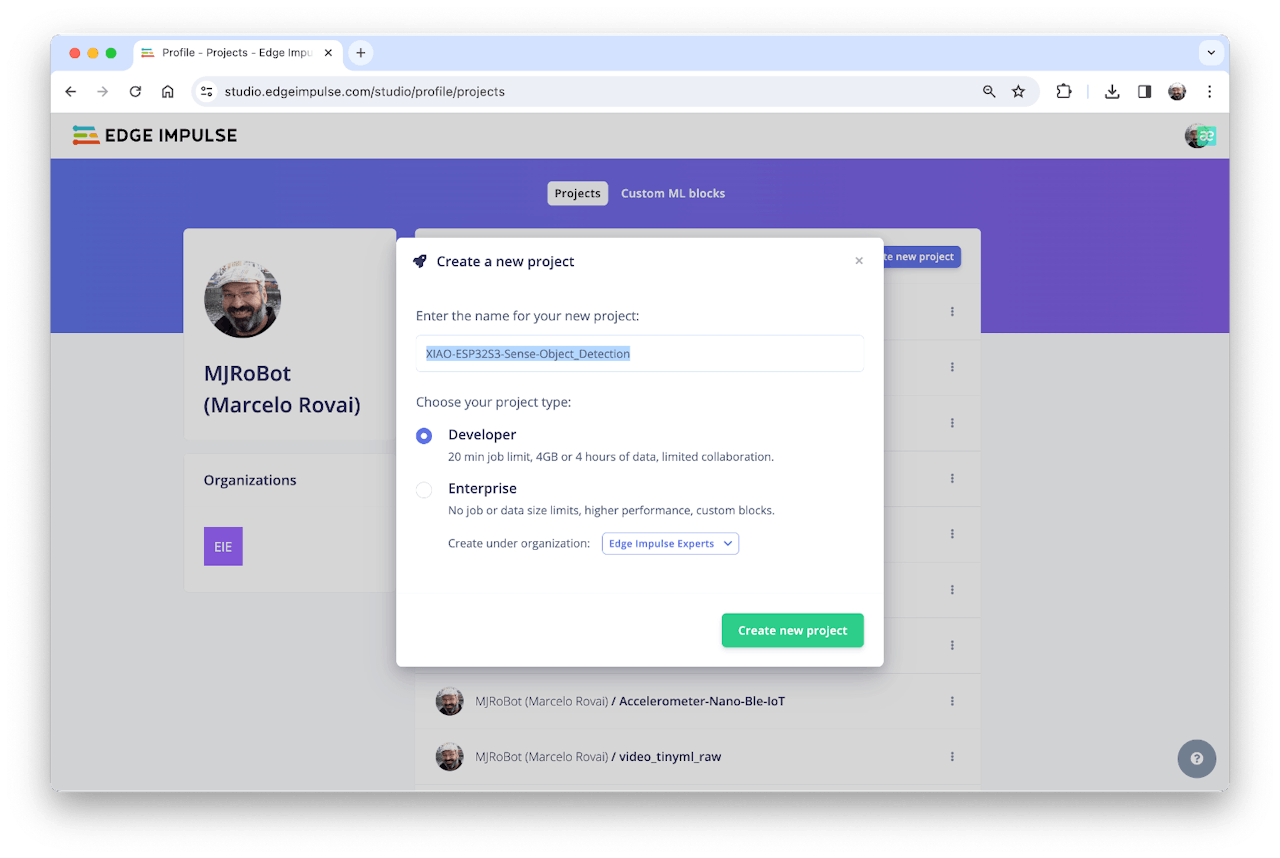 Go to Edge Impulse Studio, enter your credentials at Login (or create an account), and start a new project.