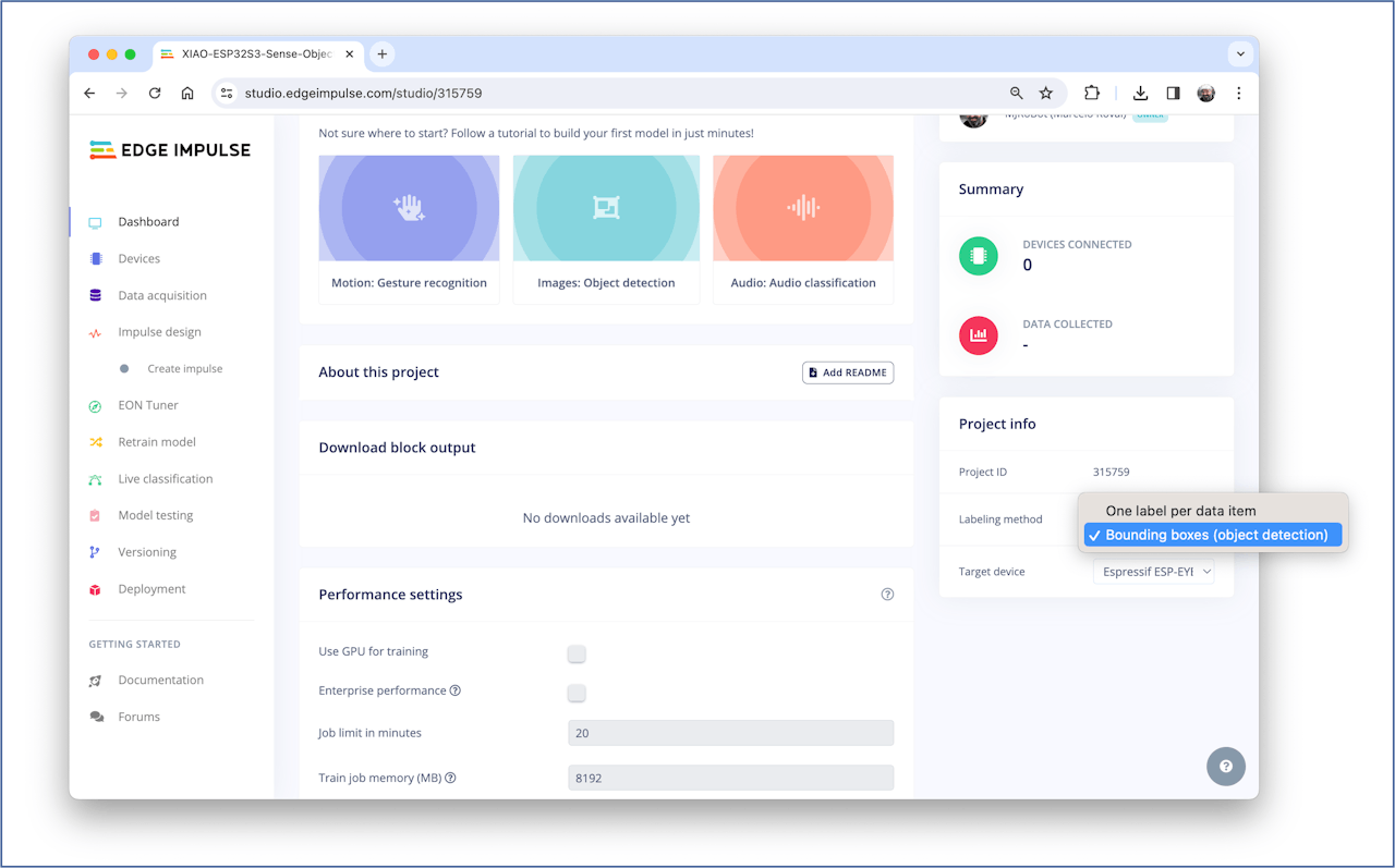 On your Project Dashboard, go down and on Project info and select Bounding boxes (object detection) and Espressif ESP-EYE (most similar to our board) as your Target Device: