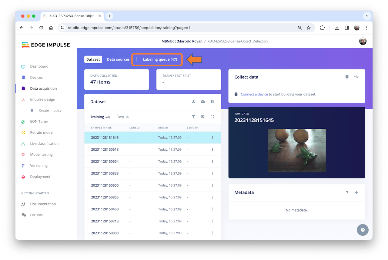 We will develop the project using the XIAO ESP32S3 for image capture and model inference. The ML project will be developed using the Edge Impulse Studio. But before starting the object detection project in the Studio, letâs create a raw dataset (not labeled) with images that contain the objects to be detected.